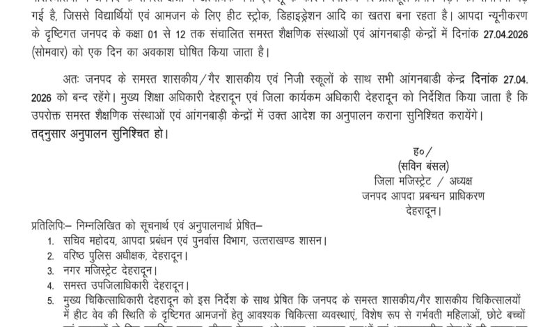 सभी क्षेत्रों में अत्यधिक गर्मी और लू के कारण स्वास्थ्य पर प्रतिकूल प्रभाव पड़ने की संभावना बढ़ गई है। जिससे विद्यार्थियों और आमजन के लिए हीट स्ट्रोक के साथ डिहाइड्रेशन का खतरा बढ़ गया है। देहरादून जिले के कक्षा 1 से 12वीं तक संचालित सभी शैक्षणिक संस्थाओं और आंगनबाड़ी केंद्रों में सोमवार को 1 दिन के अवकाश की घोषणा की गई है।