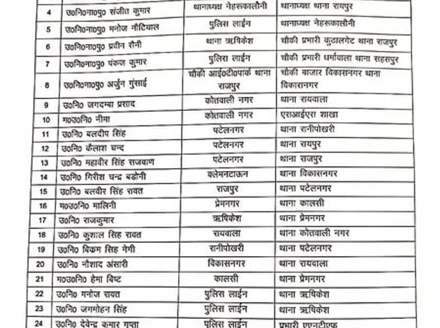 नेहरू कॉलोनी थाने का प्रभारी मनोज नौटियाल को बनाया गया है। मनोज को पुलिस लाइन से भेजा गया है। इसके अलावा कुठालगेट का चौकी प्रभारी प्रवीन सैनी को बनाया गया है। इसके अलावा 26 और अधिकारियों को इधर से उधर भेजा गया है।