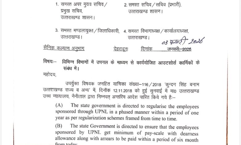 उत्तराखंड सरकार ने उपनल कर्मियों के लिए समान कार्य समान वेतन का आदेश जारी कर दिया है। उपनल कर्मचारी संगठन लंबे समय से इस मांग को लेकर आंदोलन कर रहे थे। दस साल की सेवा वाले आठ हजार से अधिक कर्मचारियों को इसका लाभ मिलेगा। इस दौरान 10 वर्ष की निरंतर सेवा पूर्ण करने वाले उपनल कर्मियों को समान कार्य–समान वेतन का लाभ दिए जाने का शासनादेश जारी होने पर मंत्री गणेश जोशी का आभार व्यक्त किया। सैनिक कल्याण मंत्री गणेश जोशी ने सभी को बधाई एवं शुभकामनाएं भी दी।